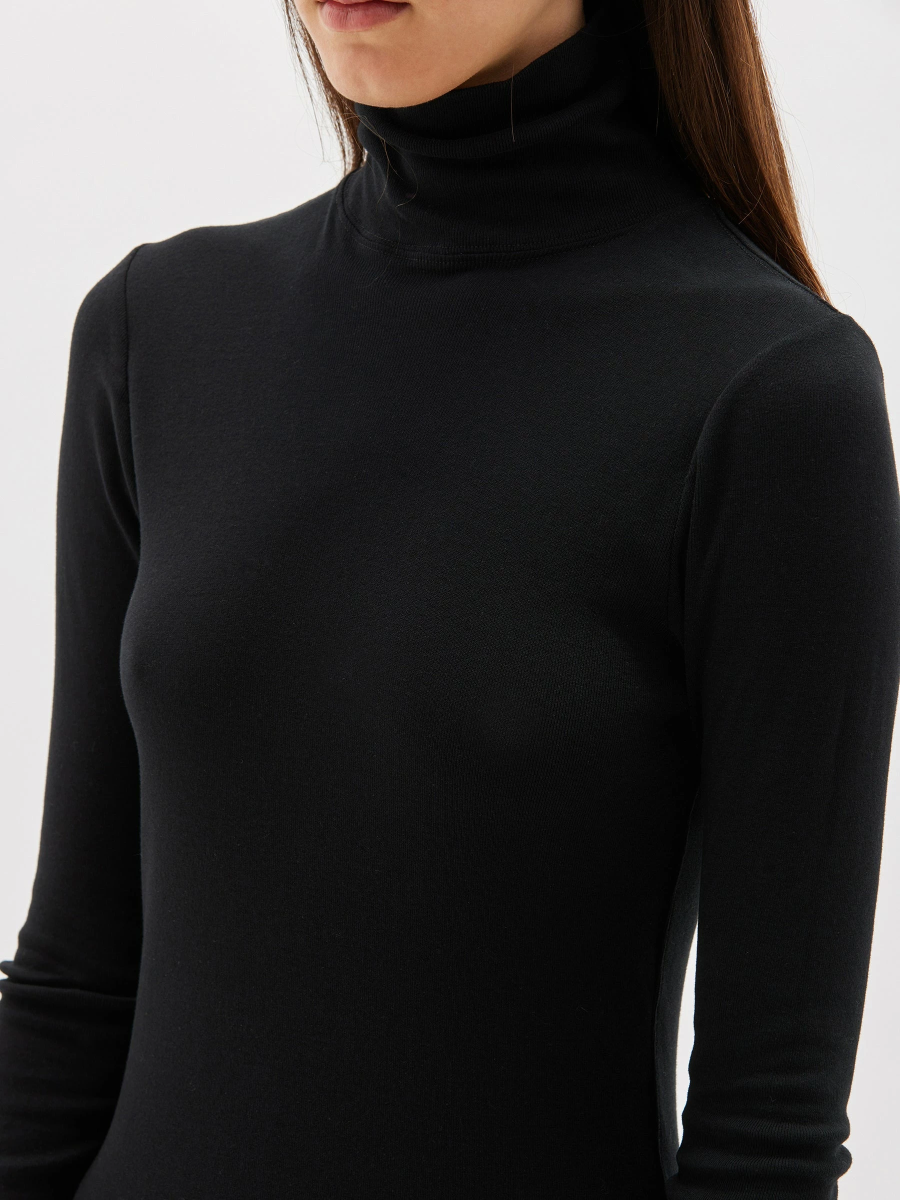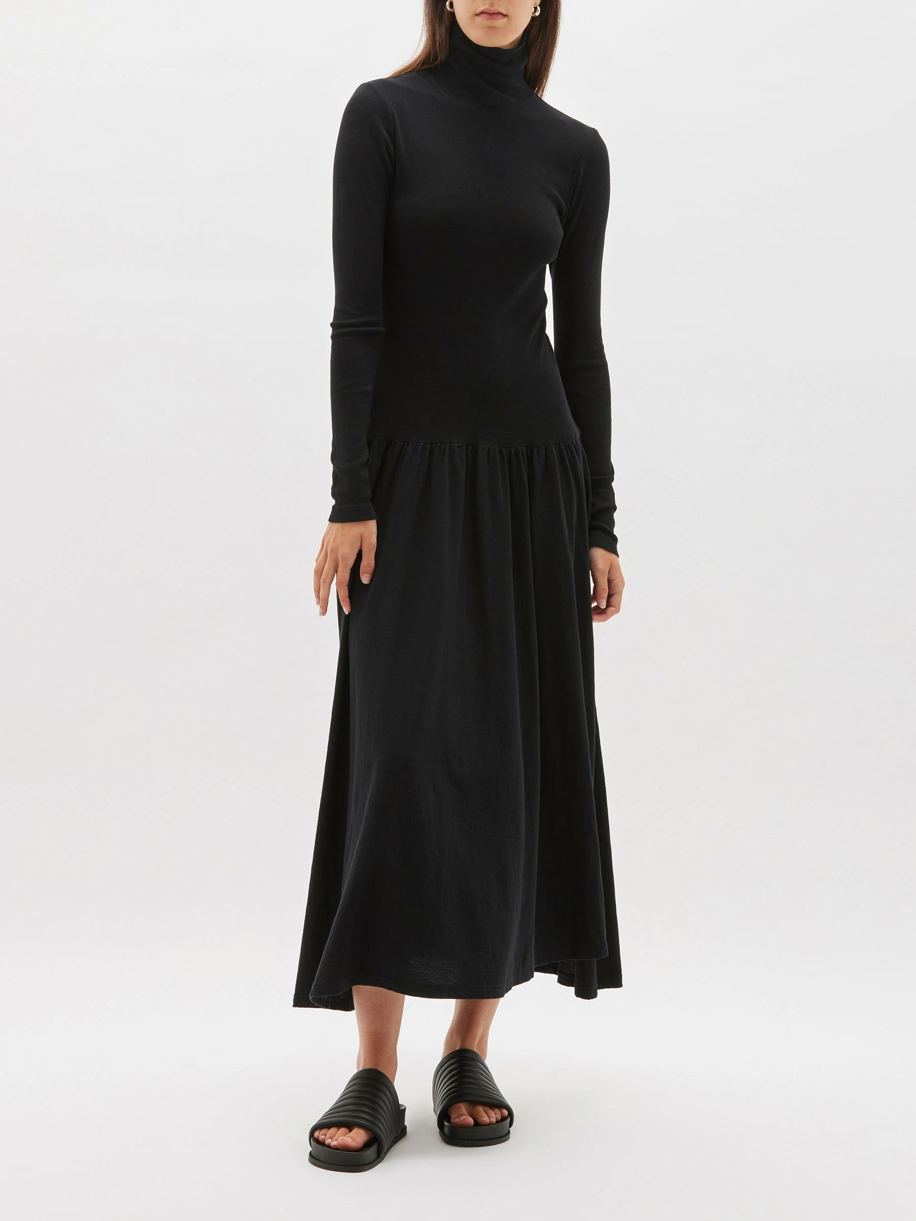 The Bassike Funnel Neck Contrast L/s Dress in Black. A longerline long sleeve dress with funnel neck detail, in contrasting organic cotton jersey. a seasonal layering dress, fitted through the body with waist gathering for a drapey midi skirt.