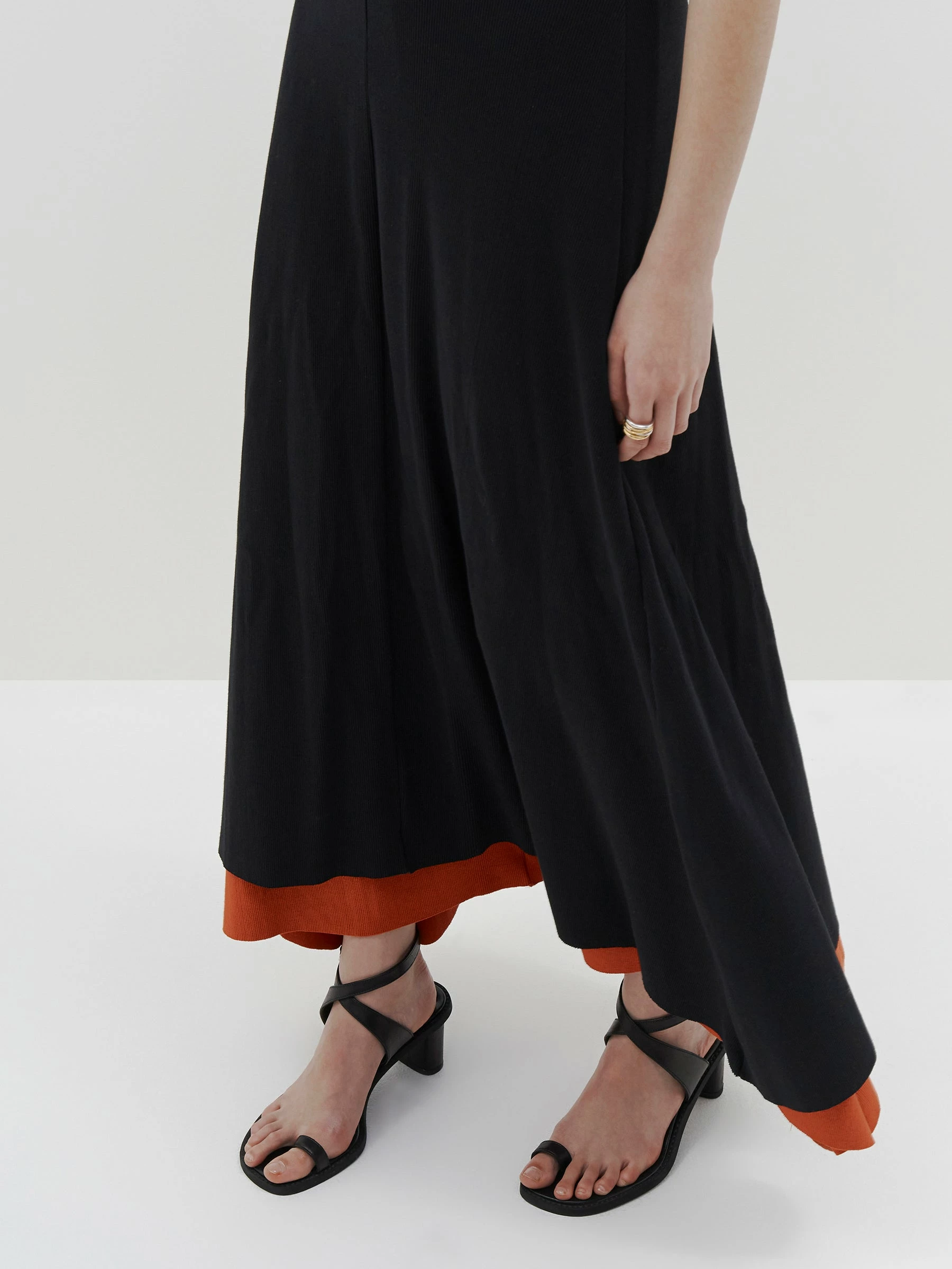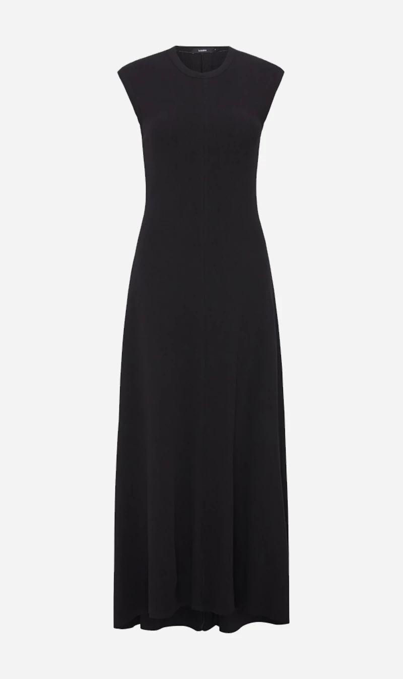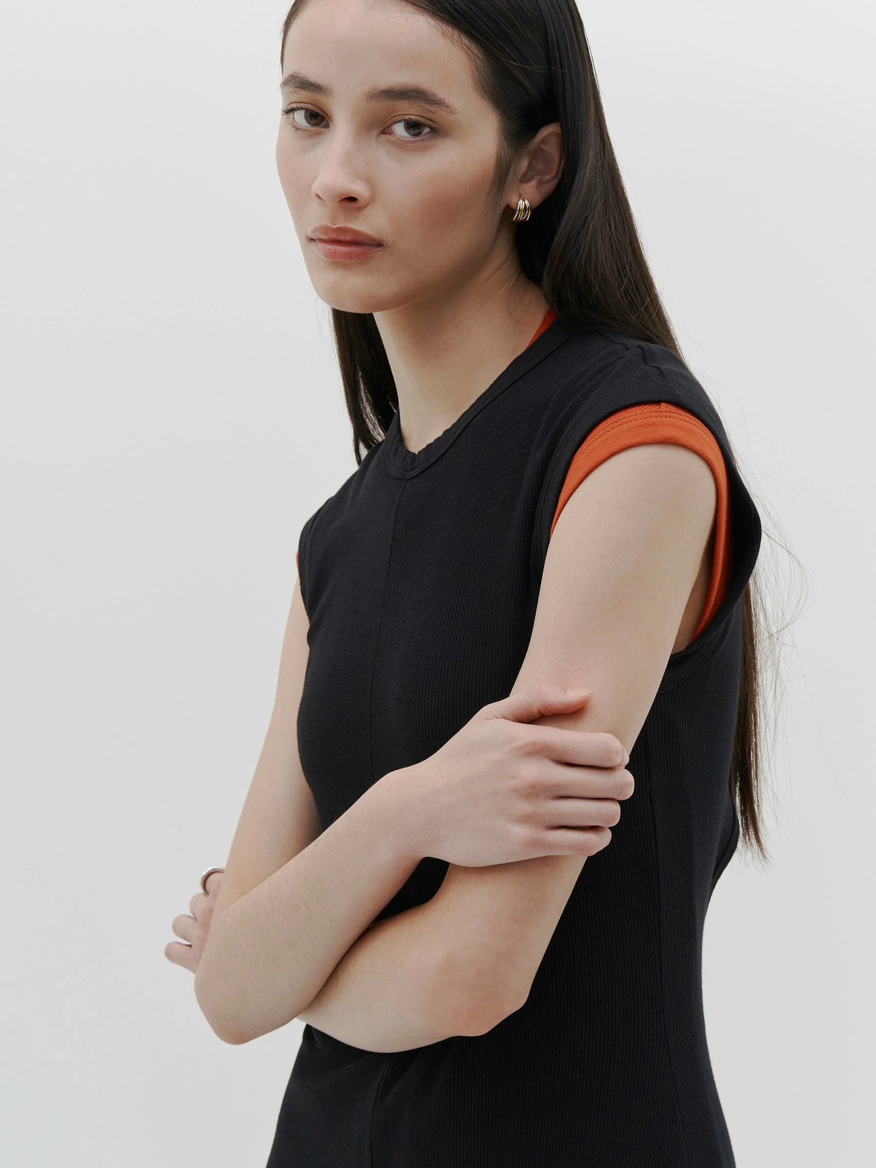 Simple and chic, the Open Back Muscle Tank Dress is an elegant, a-line over the shoulder tank dress in cotton blend mini rib. Featuring lower back cut out and raw edge hem, pair with a simple slide and layer with an open linen shirt.Â