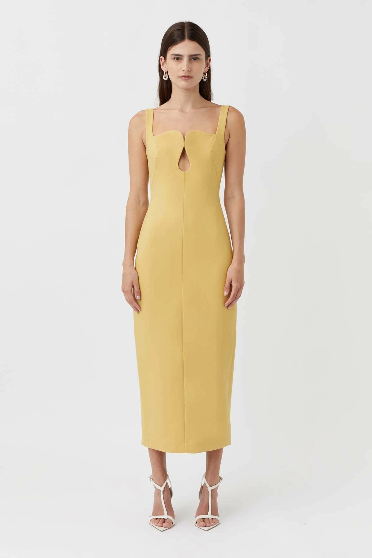 The wow dress of the season! The Camilla and Marc Brixton in Mustard Yellow. This elegantly tailored black midi dress features a curved neckline and a dramatic cut-out feature on the bust. Designed for a sleek fit, this dress features paneled shaping, a back skirt split, and adjustable straps. This classic midi dress pairs perfectly with a long-line oversized coat and pointed pumps for a timeless occasion look.