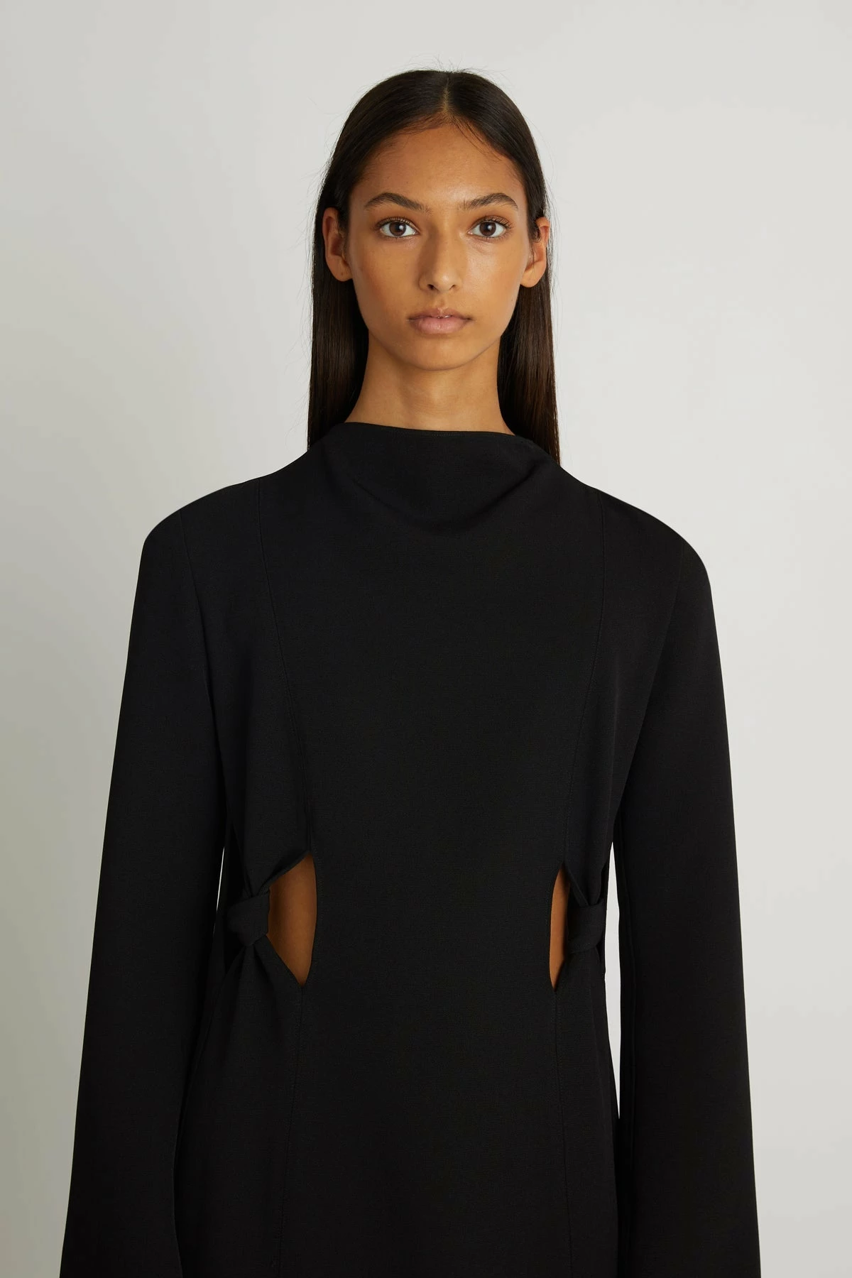 - Long sleeve midi dress with waist knot detail in a stretch crepe fabrication