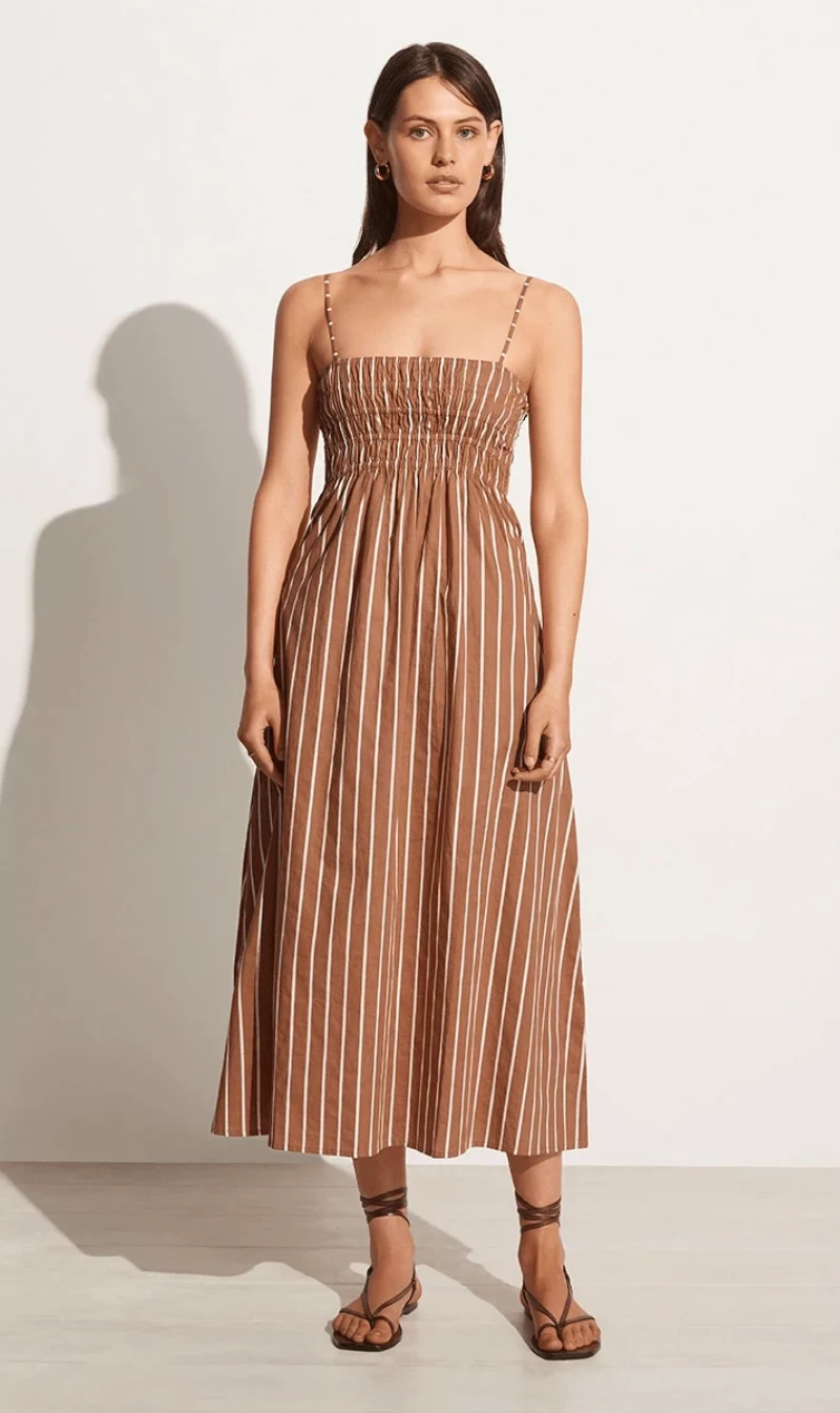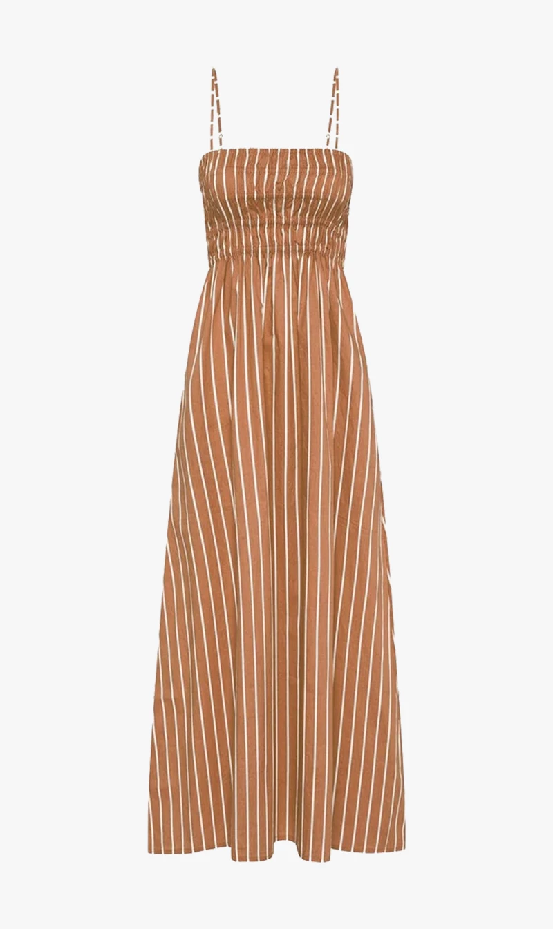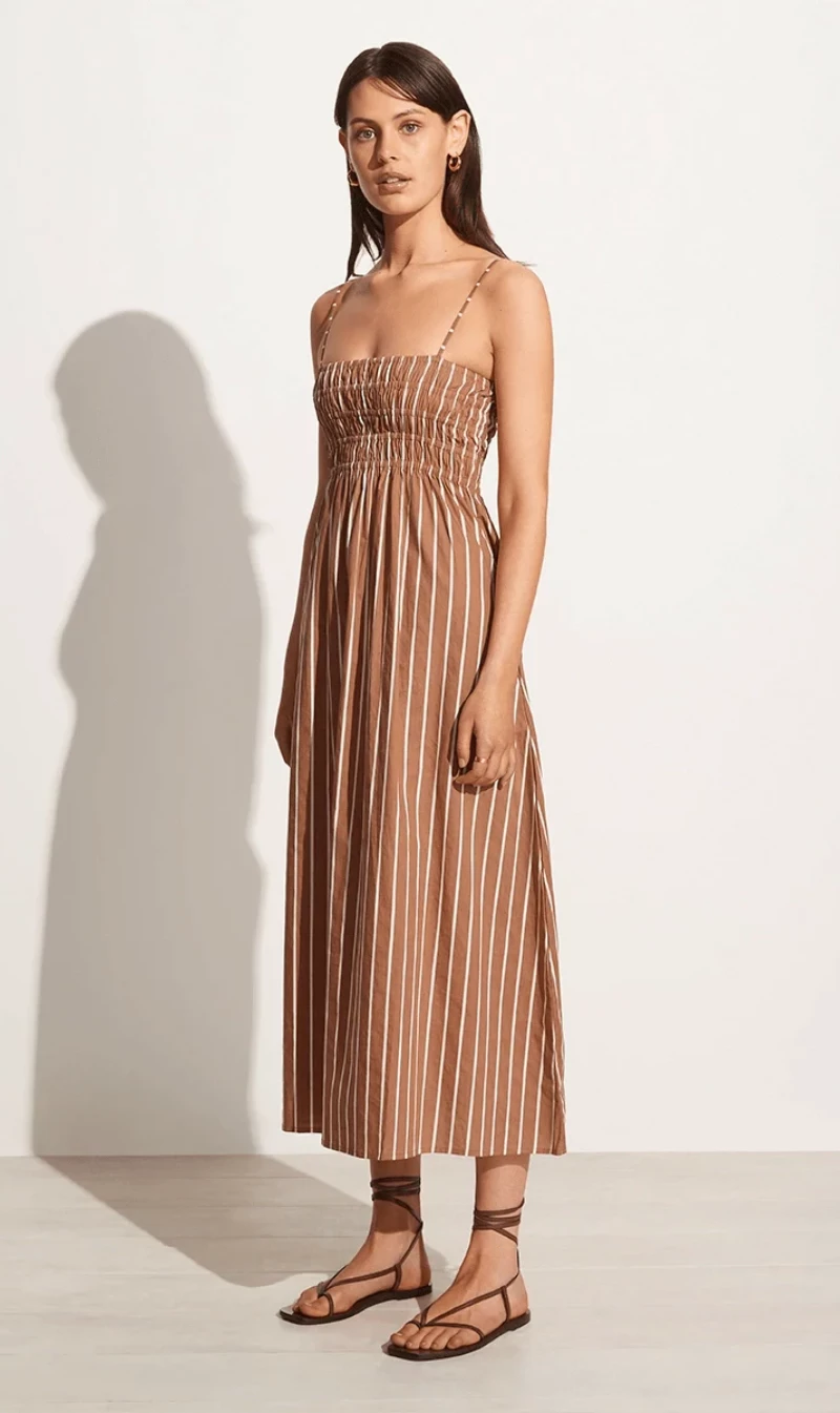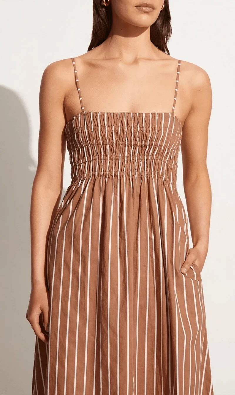 The Faithfull The Brand Marieka Midi Dress in Ada Stripe is a closet staple you will love for years. Boasting effortless femininity, this dress offers a flattering straight neckline, gathered elastic bust detail, adjustable straps and side pockets. Mindfully made from certified organic cotton poplin, this dress pairs back beautifully with your favourite mules or strappy sandals.