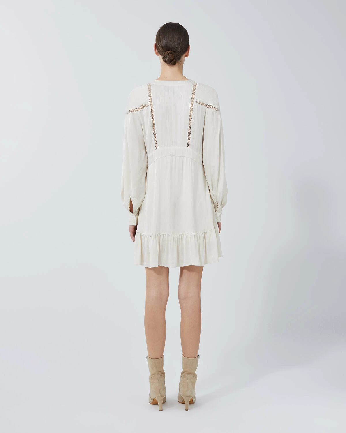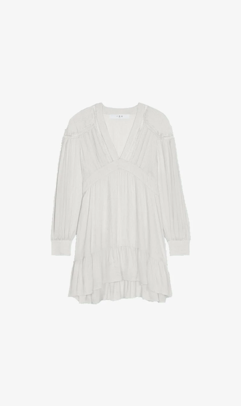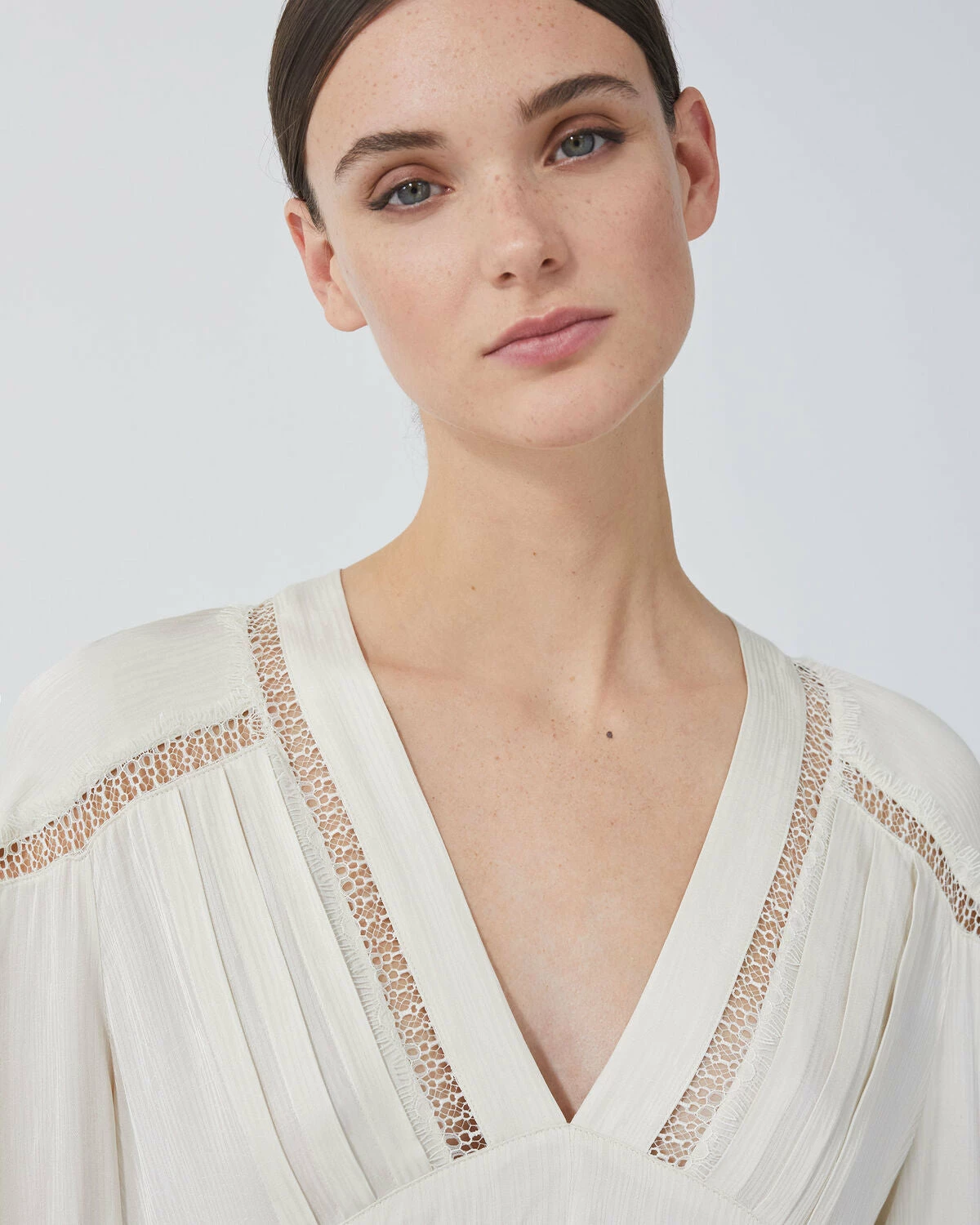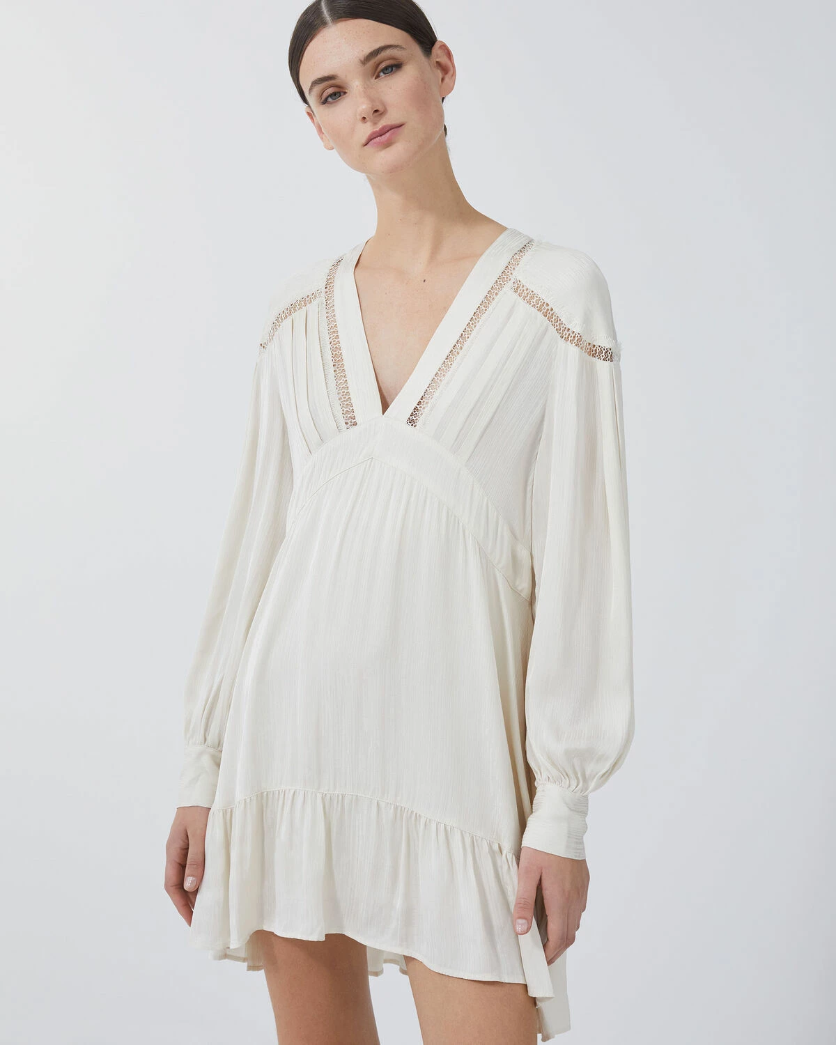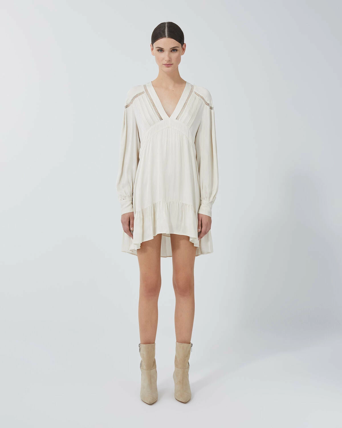The IRO Bilam Dress in Ecru. A low-cut dress in fluid and airy crêpe de Chine. Featuring Front pleats and lace finishes and billowy sleeves.