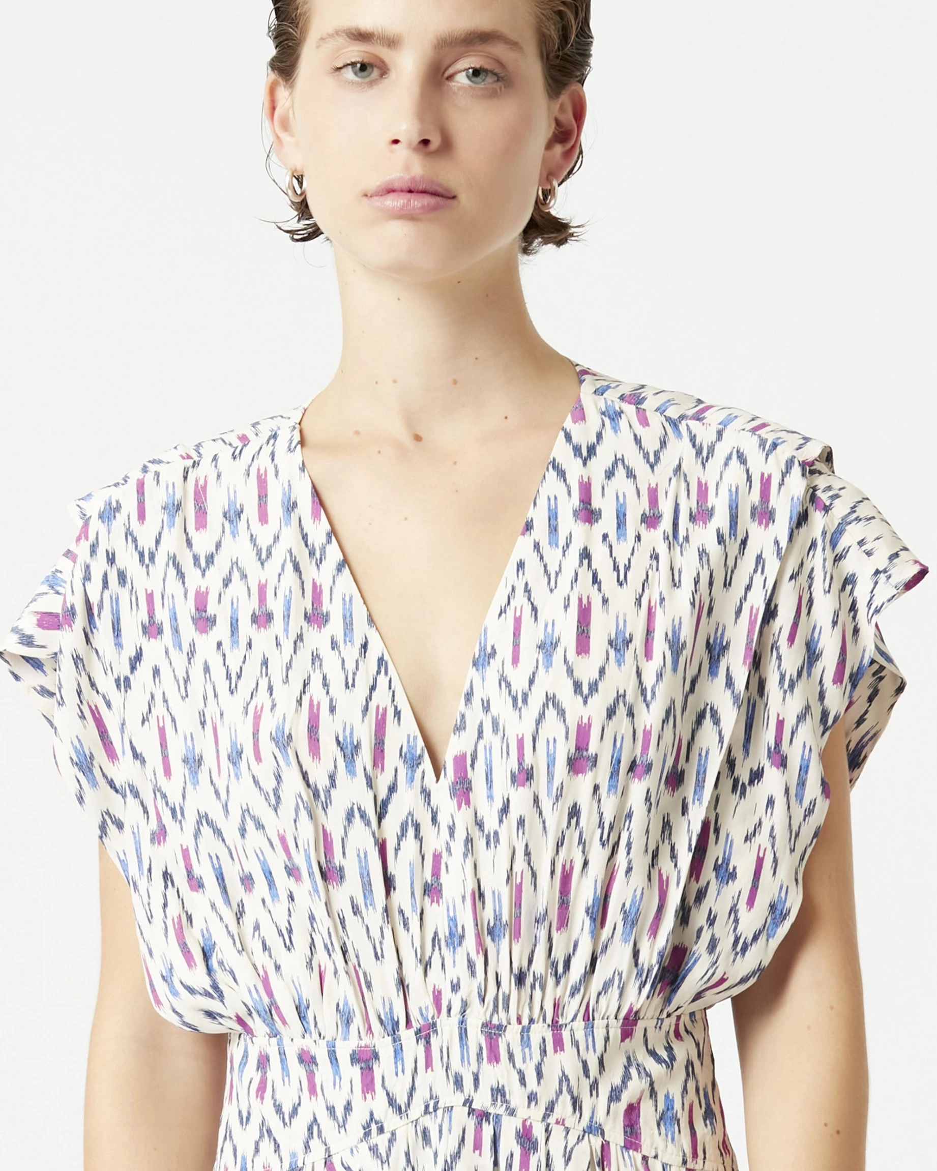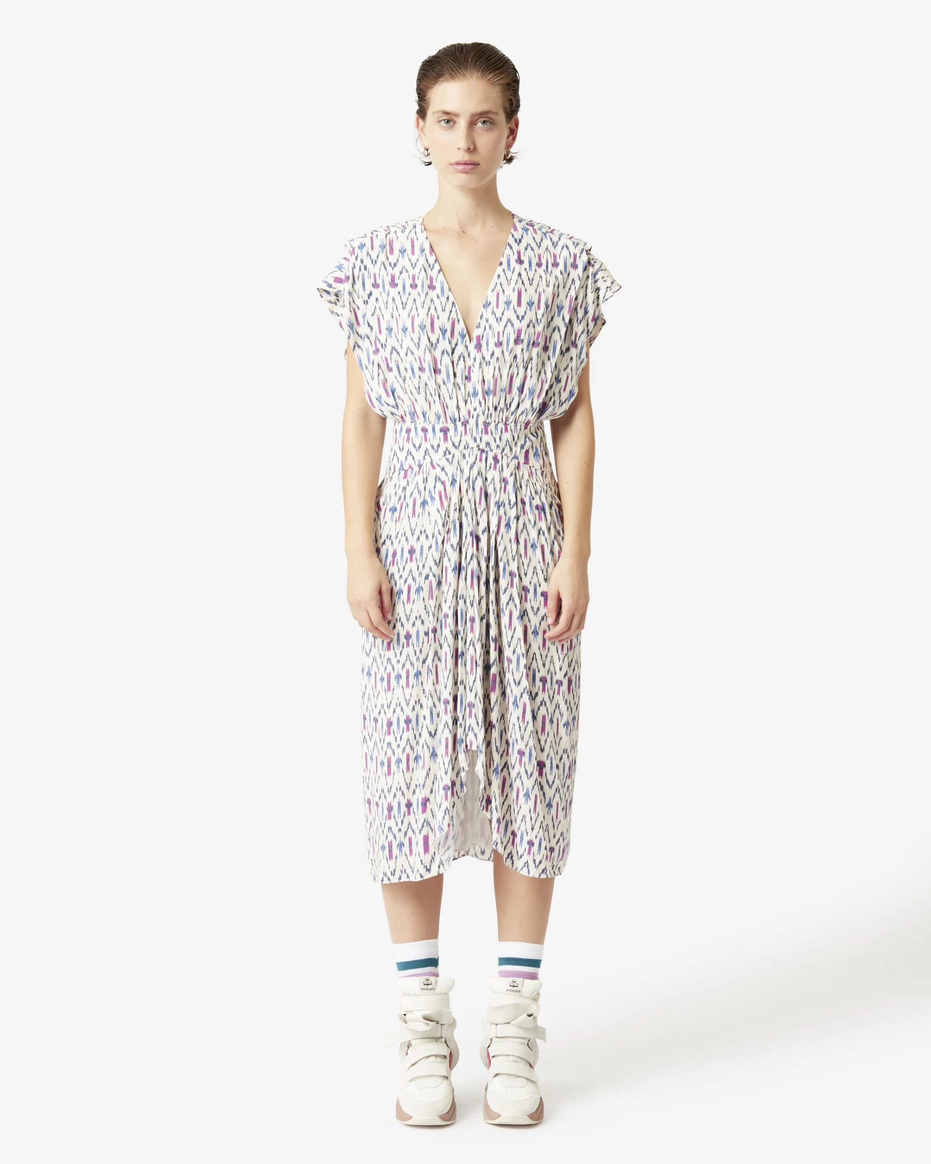 The Isabel Marant Almeya Dress in Ecru. A Long viscose dress with short sleeves featuring a V neck and Zip fastening.