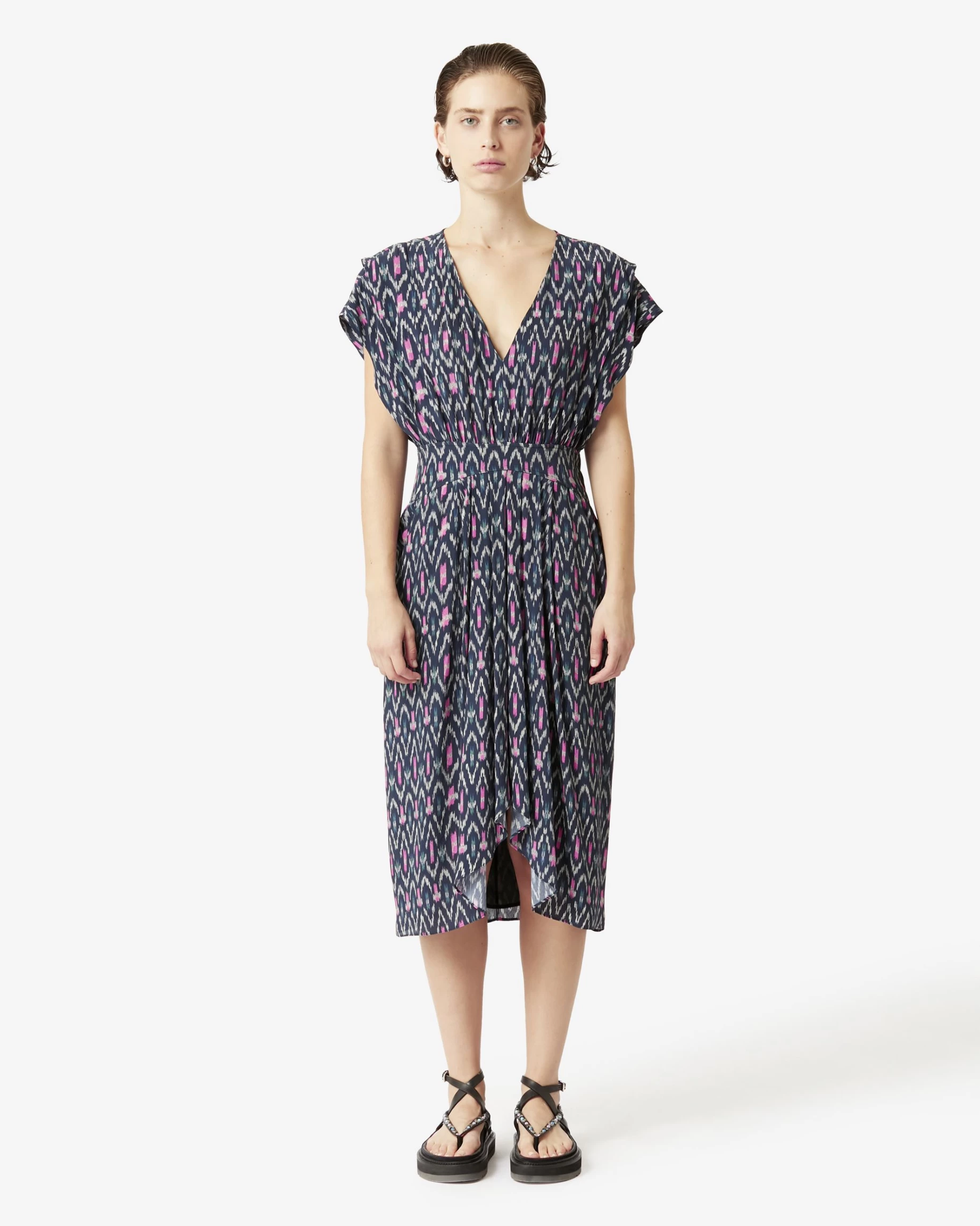 The Isabel Marant Almeya Dress in Faded Night. A Long viscose dress with short sleeves featuring a V neck and Zip fastening.