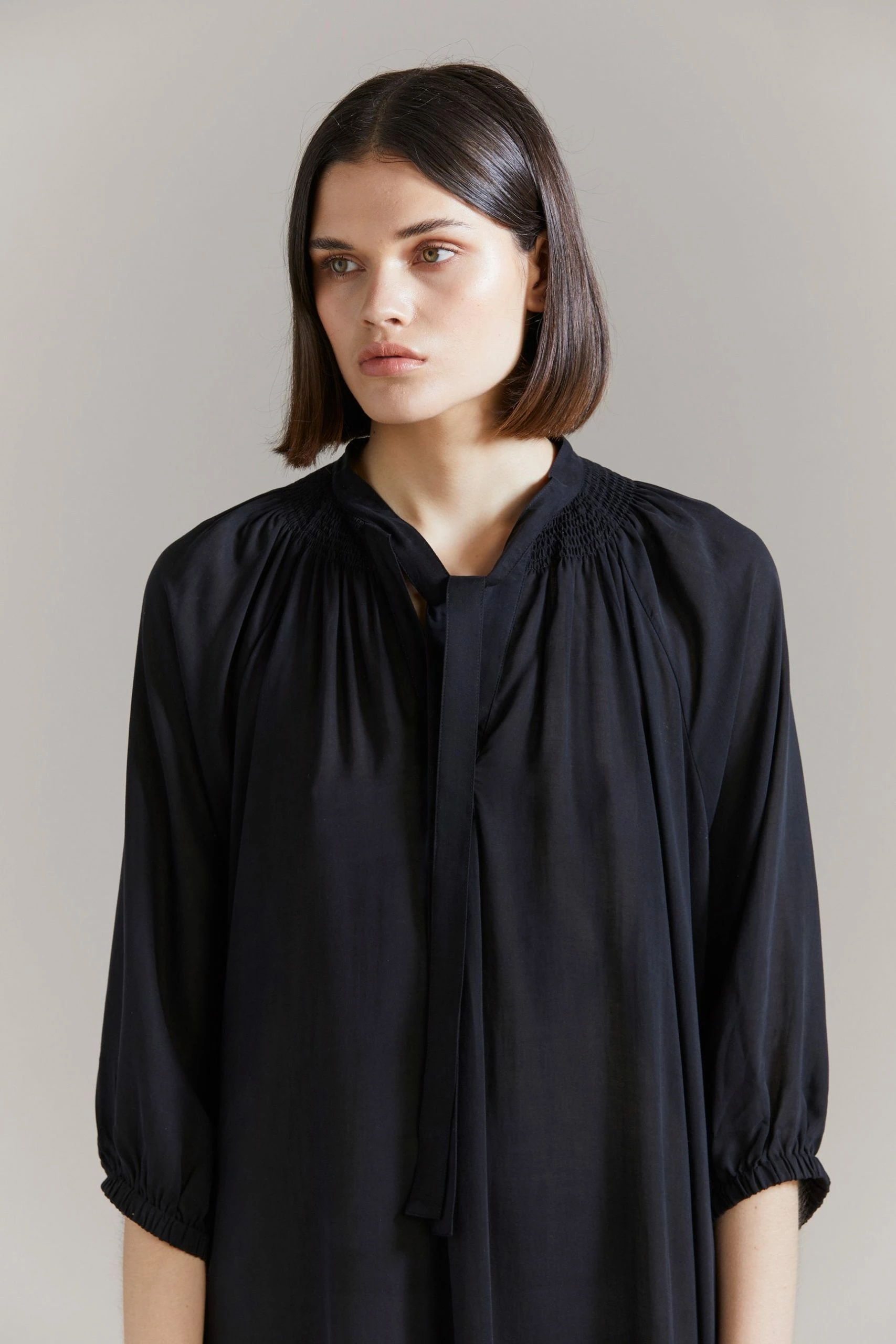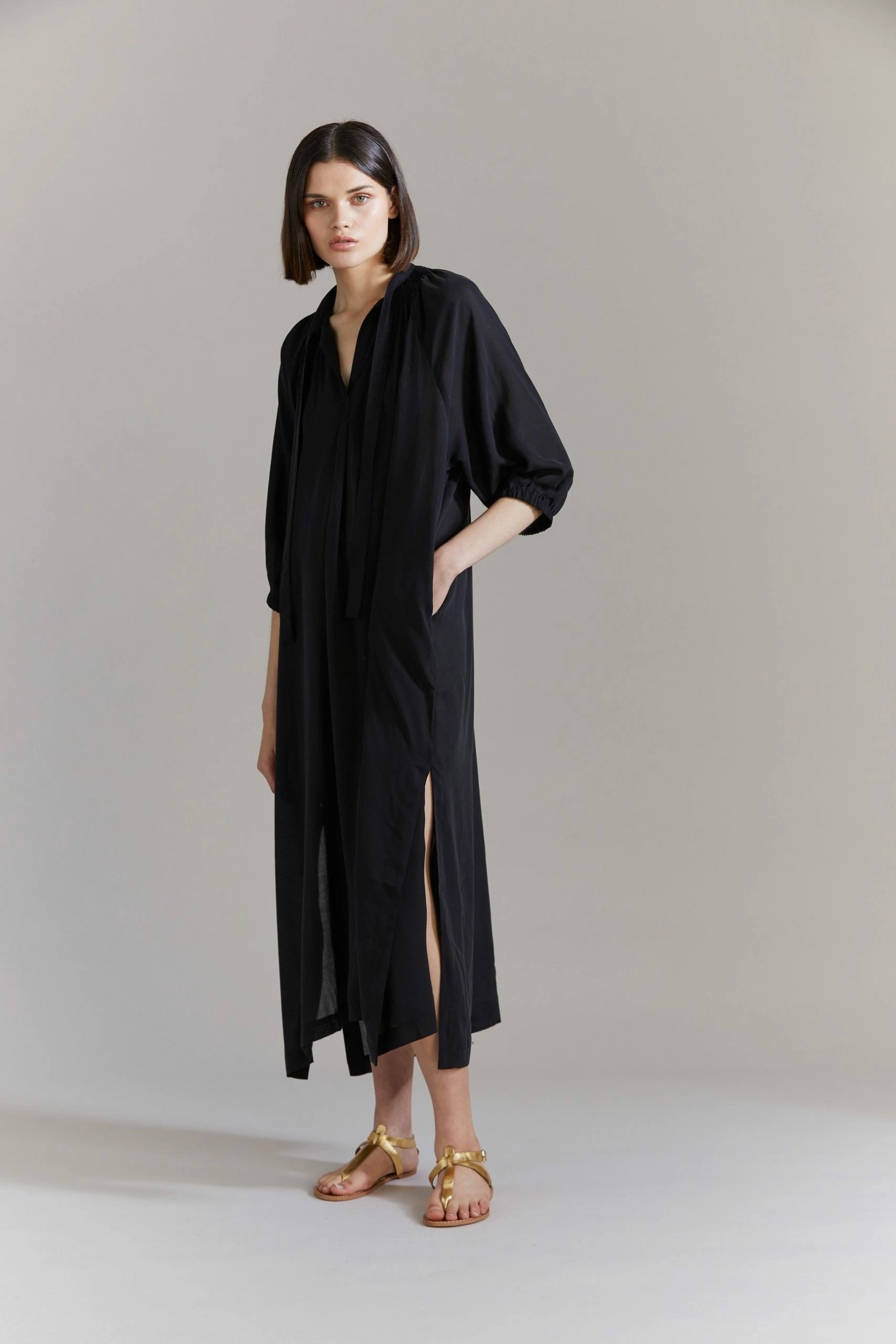 The Laing Celeste Popover Dress in Black. The perfect dress to toss on over the top of your swimsuit, after a shower while lounging at home, or layer with a slip as an elegant solution to relaxed summer dressing.