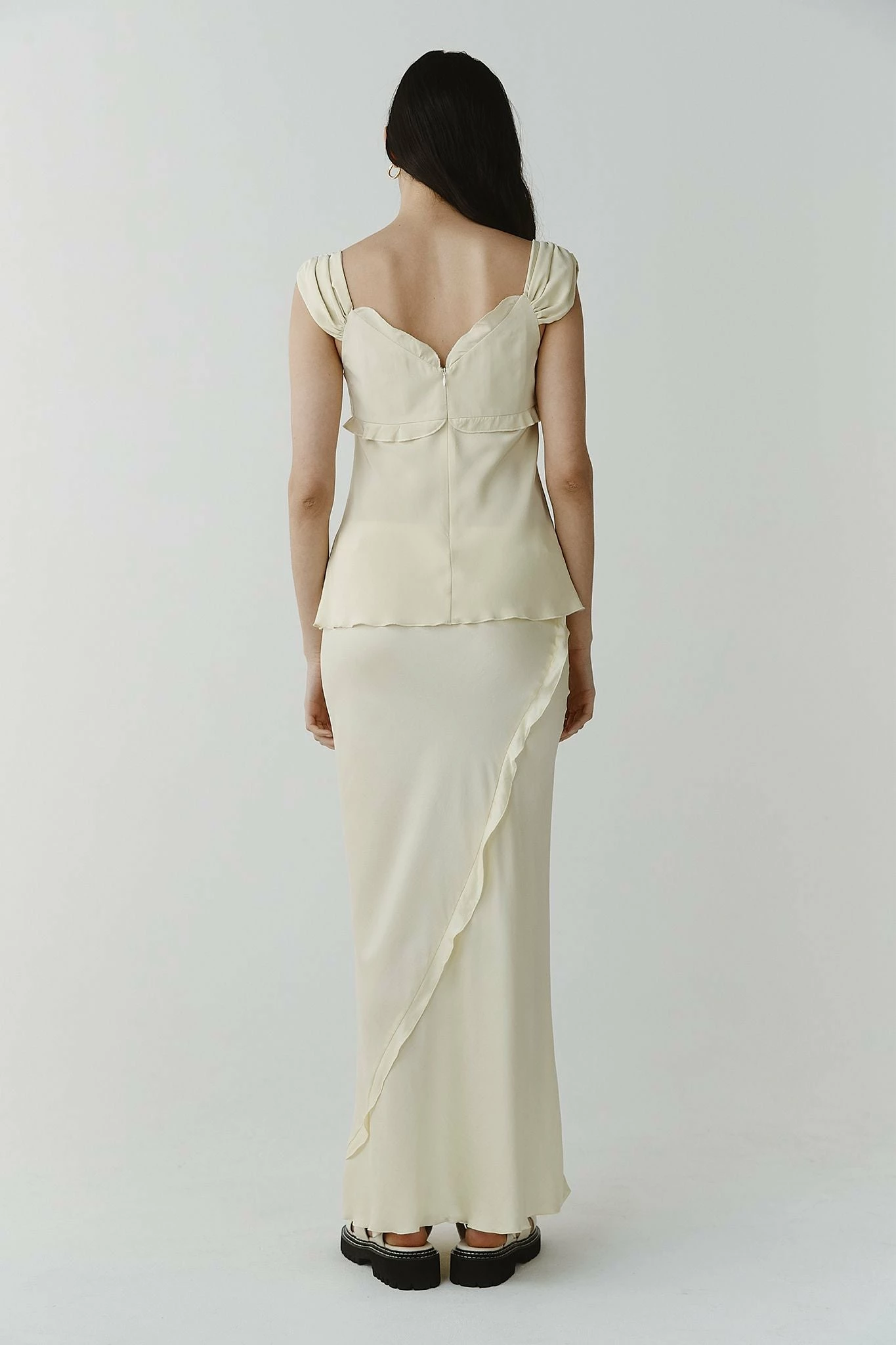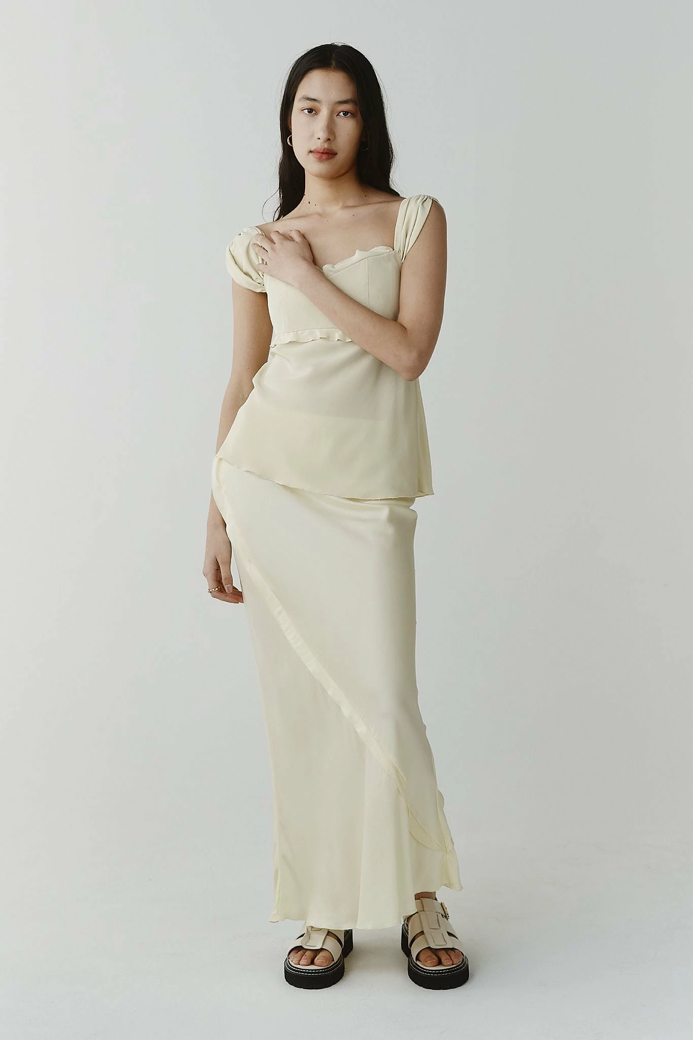 The Marle Florencia Skirt in Limoncello is a beautifully feminine piece crafted from sand-washed silk. A simple bias cut silhouette that sits on a thin elasticated waistband and is elevated with the subtle addition of a raw ruffle hem detail across the front and back.