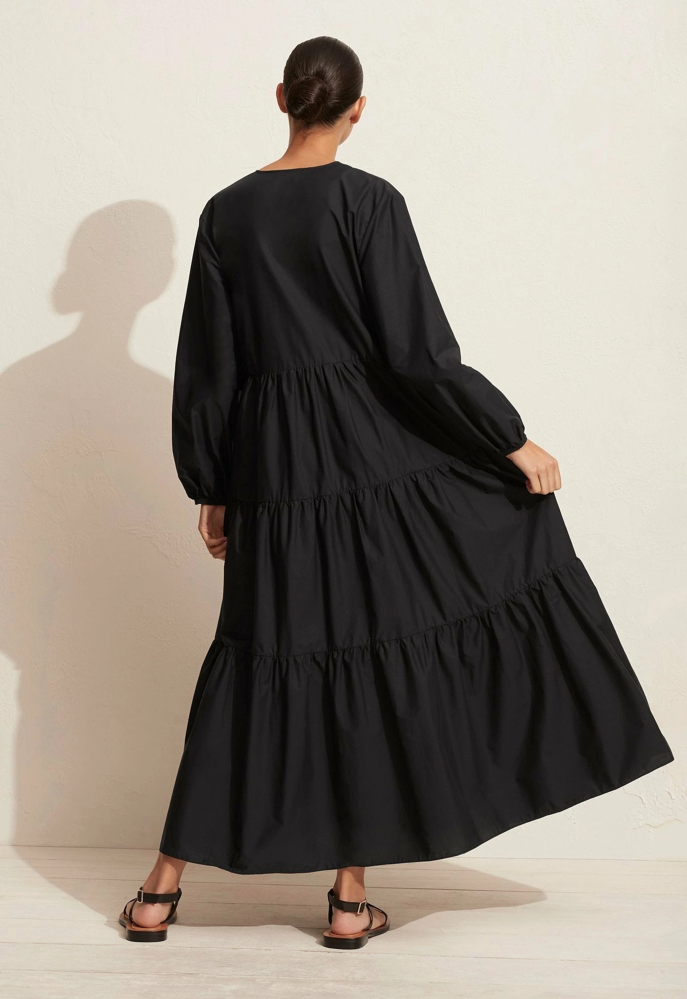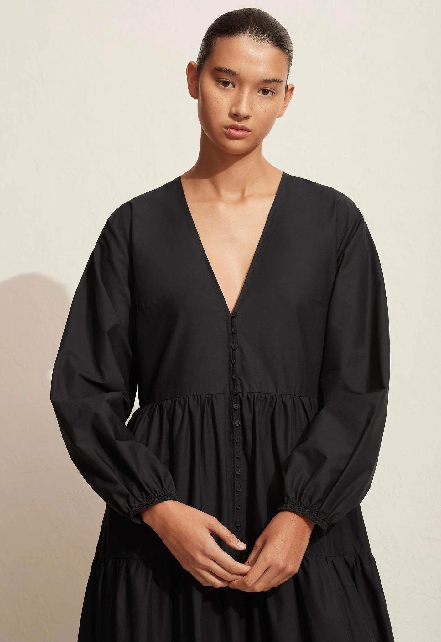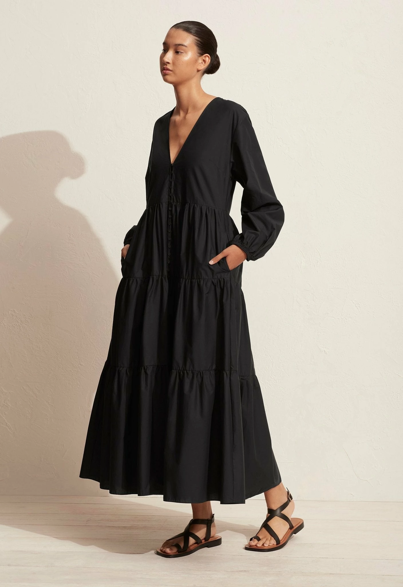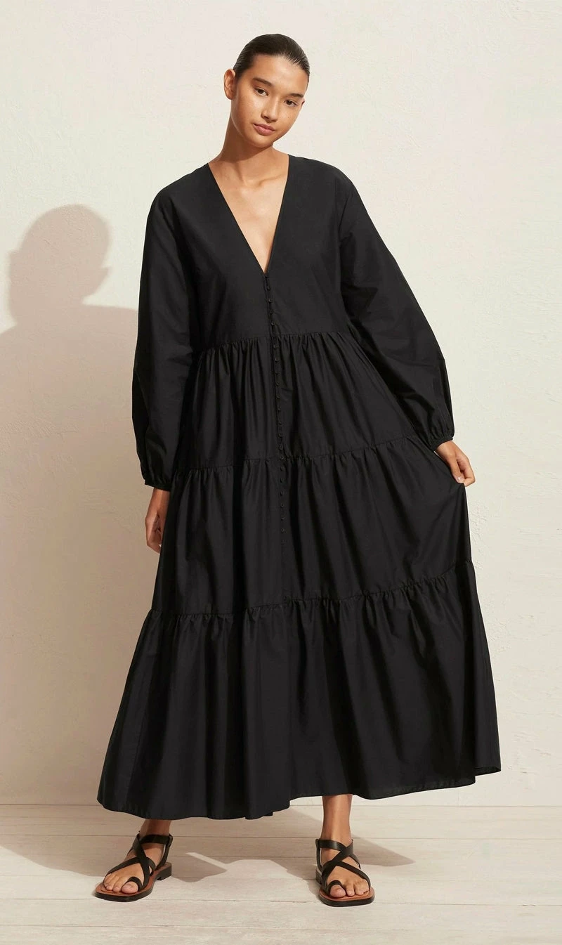 The Matteau Long Sleeve Button Dress in Black. An evolution of our Long Sleeve Tiered Dress, with a more fitted bodice and loop and button front closure detail. V neckline finished with grosgrain. Balloon sleeves with elastic cuff and side pockets. Lightweight mercerised 100% Organic Cotton. Made in Australia.