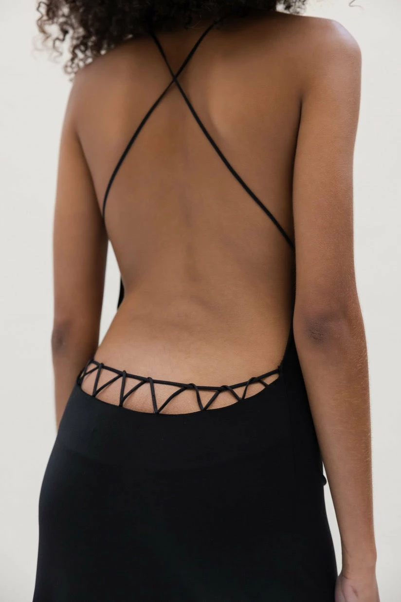 The Musier Paris Sifnos Dress is a chic mini dress with a statement open back. The long dress features a crossed straps, cowl neck, bare back in jersey.