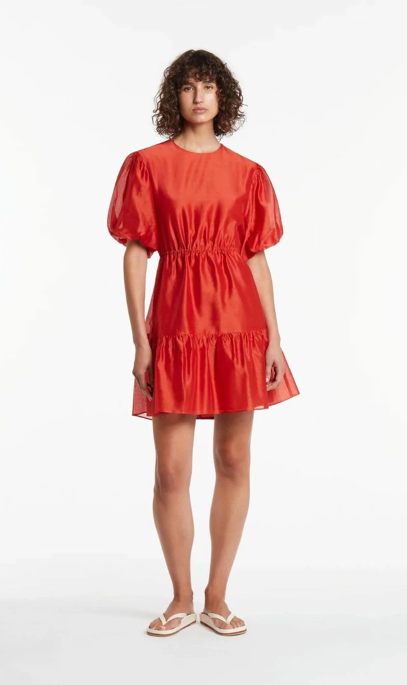 The SIR The Label Lucelia Puff Sleeve Mini Dress is a classic open back mini, constructed in lightweight cotton/ silk in vibrant red. Features exaggerated puff sleeves with a tiered full skirt and an open back.