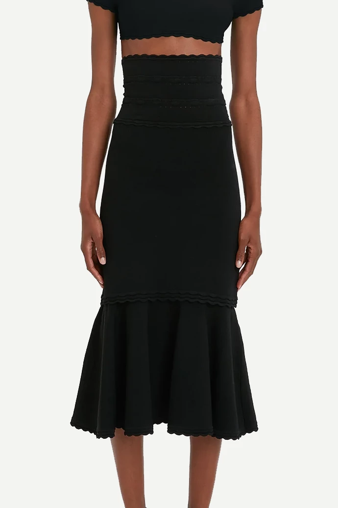 The Victoria Beckham Flared Skirt in Black is created in a stretch knit fabric making it perfectly body sculpting and the extra-high waistline and midi-length hem creates an elongated silhouette. Repeat scalloped detailing at the waist and a flared skirt add a feminine counterpoint to the sleek, form-fitting aesthetic.