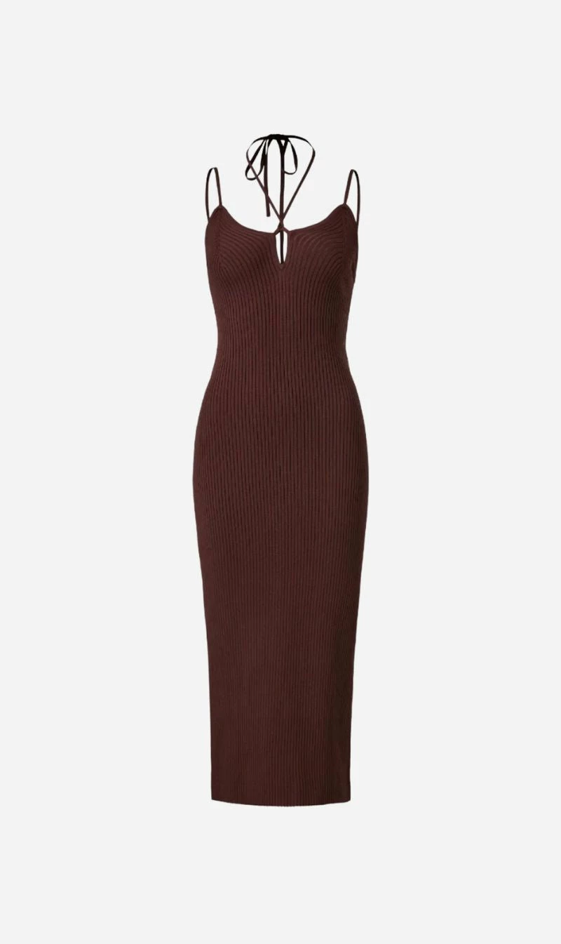 Elegant in chocolate, the Reynolds Dress from Viktoria And Woods is crafted in a heavyweight viscose fabrication to positively hug the figure. Constructed in a thick rib knit and falling to a deep V neckline, this style is finished with versatile halter straps that can be worn in multiple ways. Hitting at midi length, pair with flats and sunglasses for effortless styling.